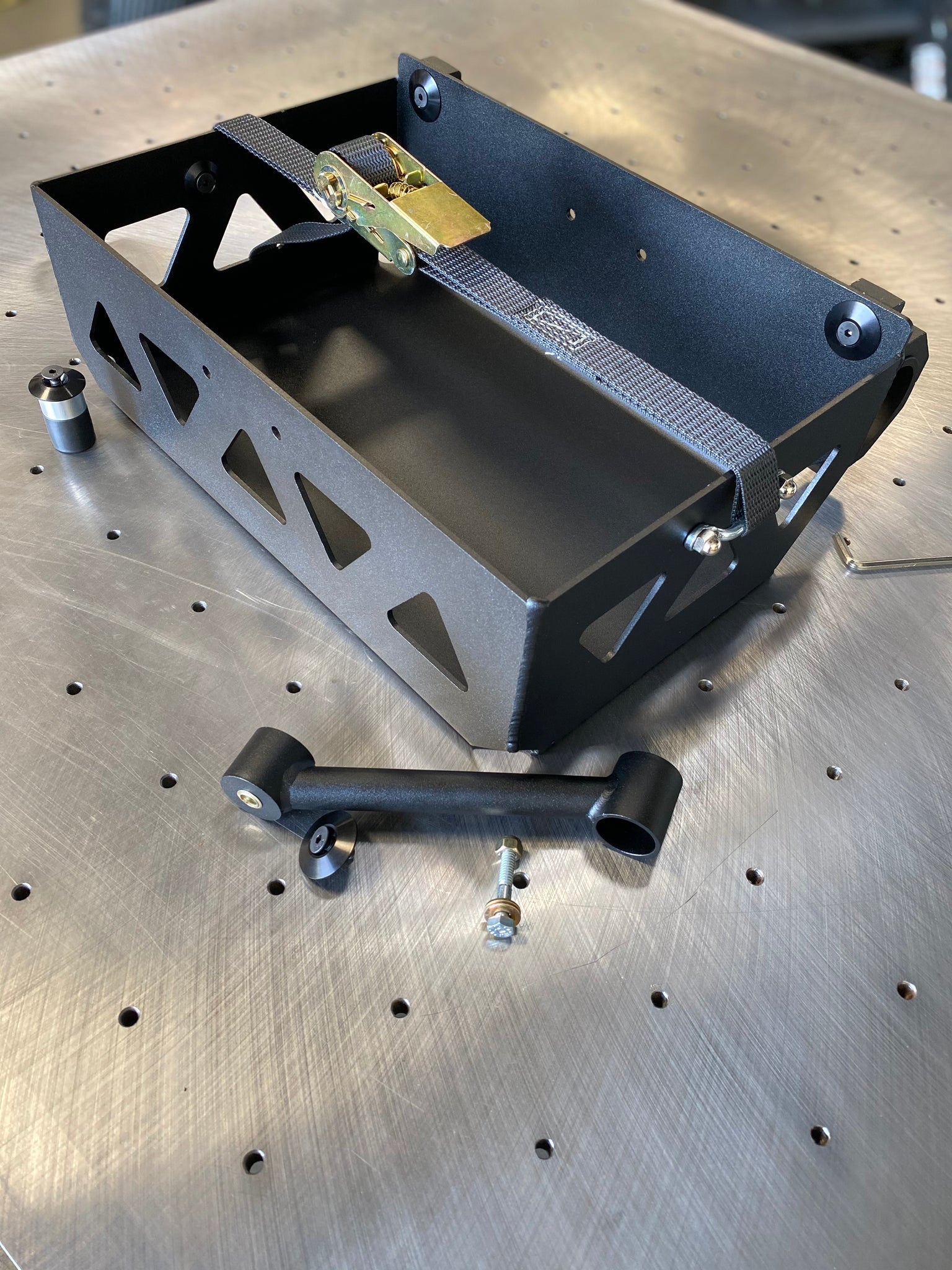 100% bolt in cooler mount, designed to work in conjunction with our Tire carrier or on its own. 3 point mount and 1 rubberized footpad ensure your frosty beverage’s stay right where you want them. Aluminum tray measures 10 3/4” x 16”. So any soft or hard ice chest inside of those measurements should work. I made the largest sized tray I could fit in the area, to try to maximize amount of ice chests customers could use. Comes with everything needed to mount and a ratcheting strap to keep your cooler/ice chest in place. Comes with a textured semigloss black Powdercoat to match the look of the stock bed.